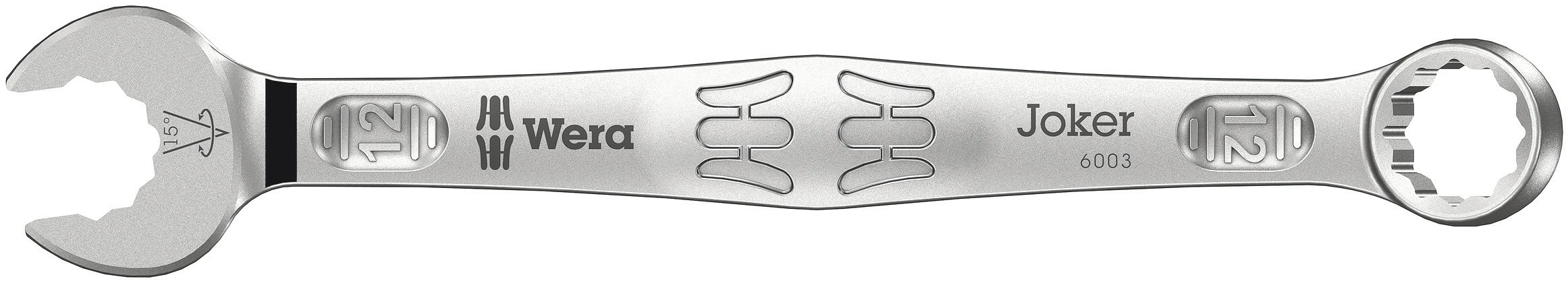 - For very tight spaces – The Joker 6003 ring spanner with its special mouth geometry – a mouth side pivoted by 7.5° and the double hexagon geometry – doubles the placement possibilities when repeatedly turning the wrench 180° around the longitudinal axis. Bolts and screw heads can be “taken“ every 15°. The Joker 6003 will automatically find the respective placement point after every turn.